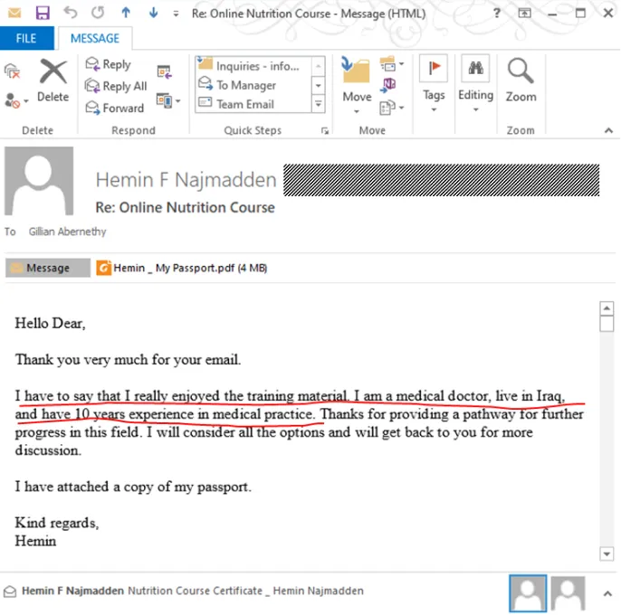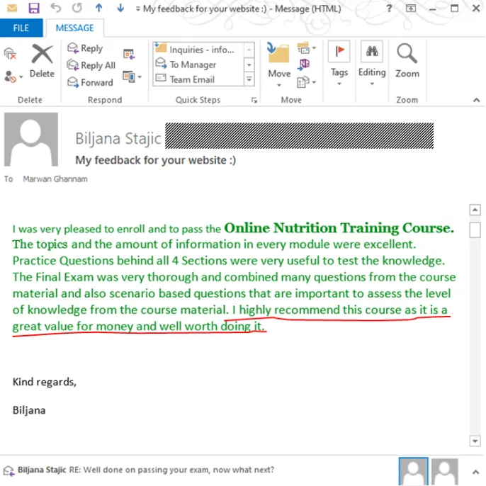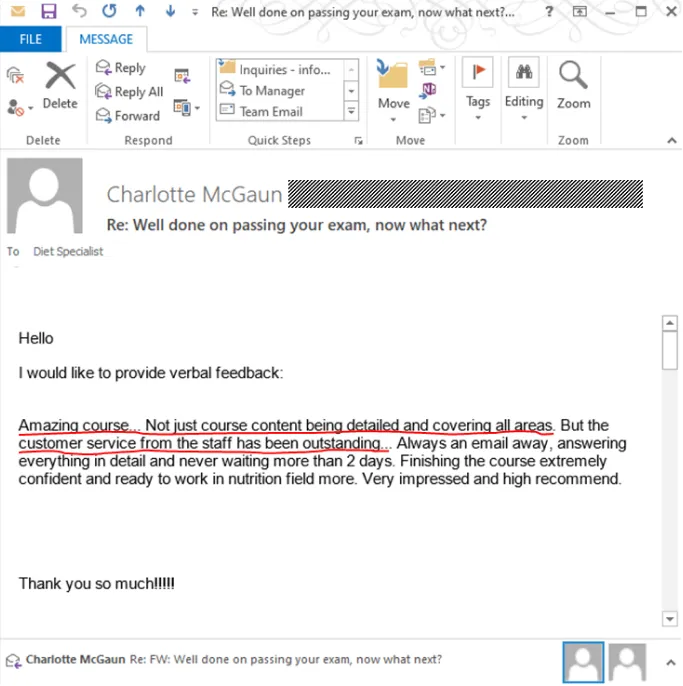 “I am overwhelmed by how good it was, how prepared I feel to go into the nutritional industry and how great it was on a scientific level and on a customer service level. A huge, huge thanks and I would recommend to anyone".