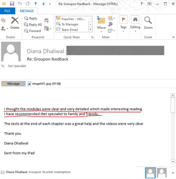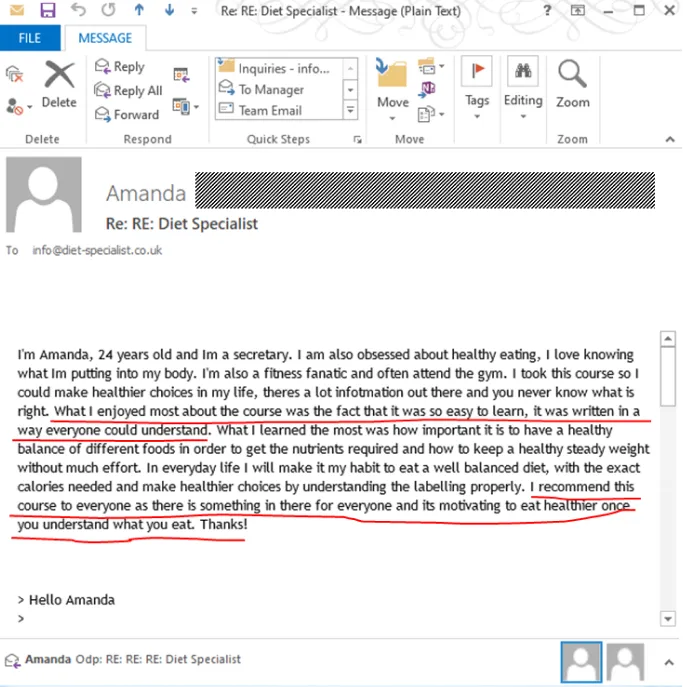 "I enjoyed how the course was set out and I found it very useful. I felt that I learnt a lot and that I can now help friends and family understand healthy eating. I would really recommend this course to other people, because the team at Diet Specialist are really helpful".