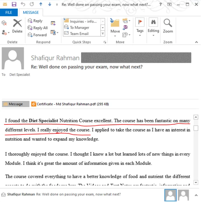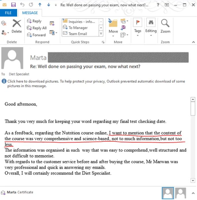 "Diet Specialist was recommended to me. Because it was self paced, I could work it around my committments. I was so happy when I passed the exam and because the course is detailed and flexible, I would recommend it to anyone. I thank Diet Specialist".