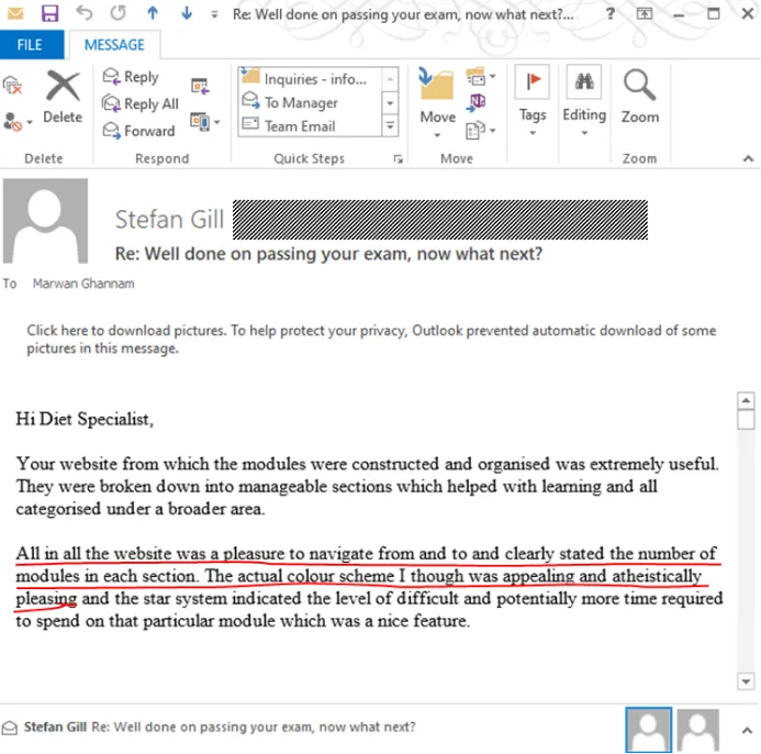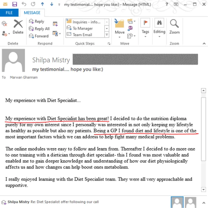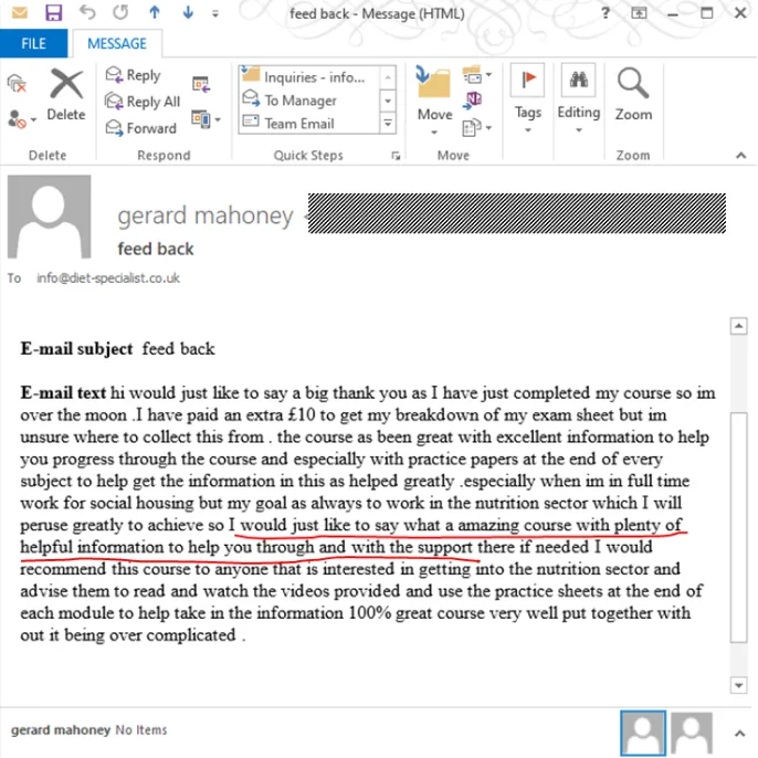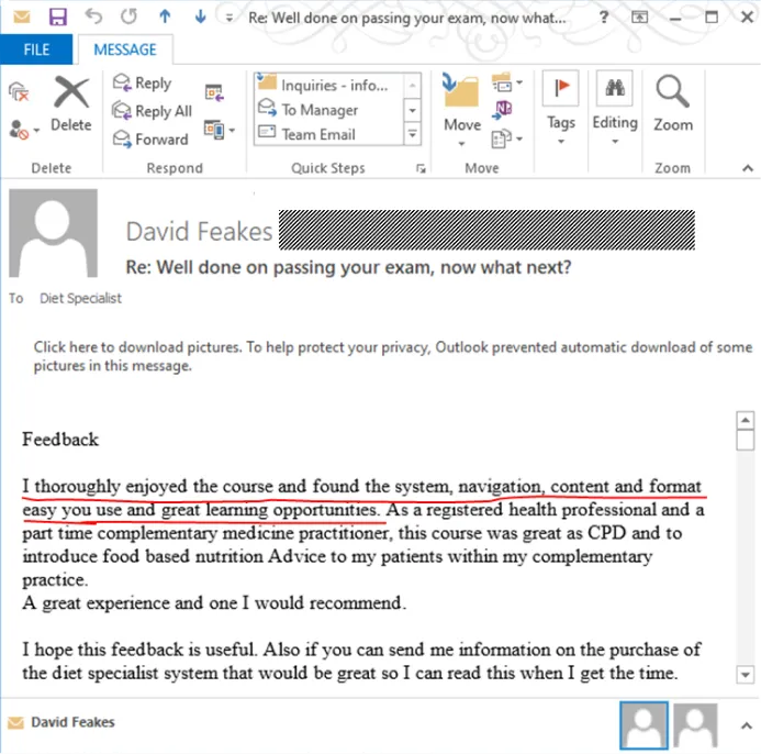 "I chose Diet Specialist as the tutors are highly regarded in the world of nutrition. The modules are clearly set out and easy to follow. I gained large amounts of vital knowledge and consolidated knowledge that I already had".